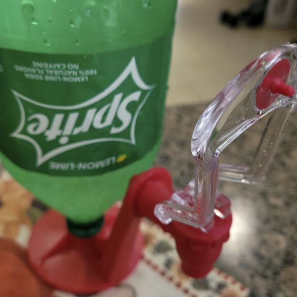 Mocno nakręć gumową część na wybraną butelkę z napojem, a następnie powoli odwróć ją do góry nogami. Umieść szklankę pod wylewką, z której wypływa napój i przesuń ją w kierunku przezroczystego uchwytu. To spowoduje, że napój spłynie do Twojej szklanki. Gdy szklanka jest pełna, odciągnij ją, a wylewka automatycznie się zamknie.