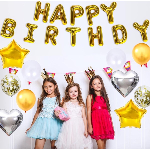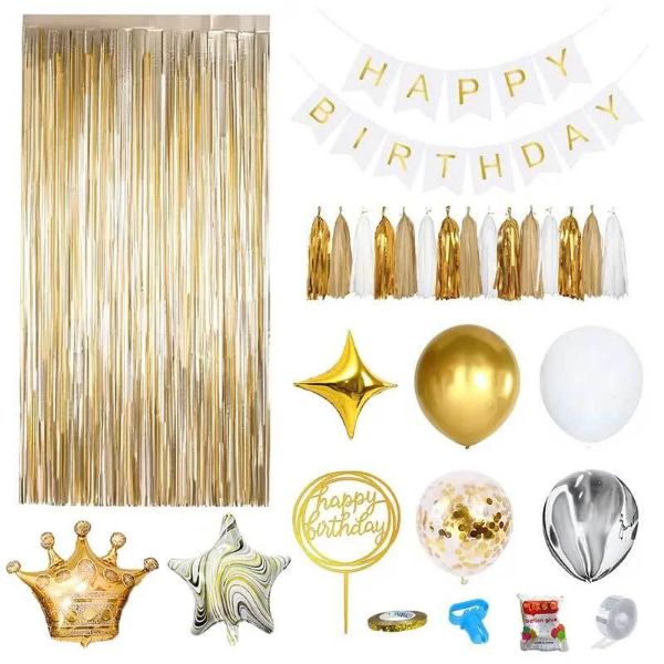 60 balonów w różnych kolorach; 1x balon w kształcie korony; 2x balony w kształcie pięcioramiennej gwiazdy; 2x balony w kształcie czteroramiennej gwiazdy; 1x kurtyna z błyszczących wstążek; 1x baner Happy Birthday; 5x zestaw kolorowych ozdobnych frędzli; 1x dekoracja tortu Happy Birthday; ozdobna wstążka, akcesoria do wiązania balonów, klej i taśma do mocowania balonów.