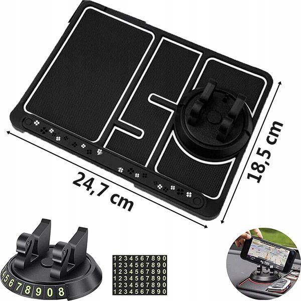 📏 Uniwersalna kompatybilność: O wymiarach 24,7 x 18,5 cm, ta mata idealnie pasuje do każdej deski rozdzielczej samochodu, zapewniając pewne i stabilne umiejscowienie.